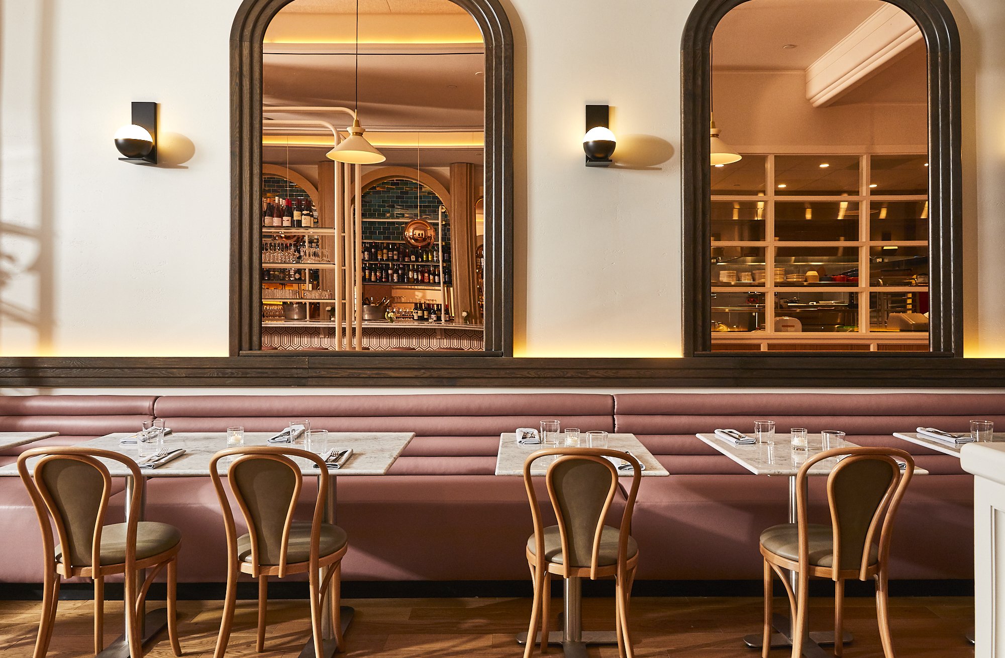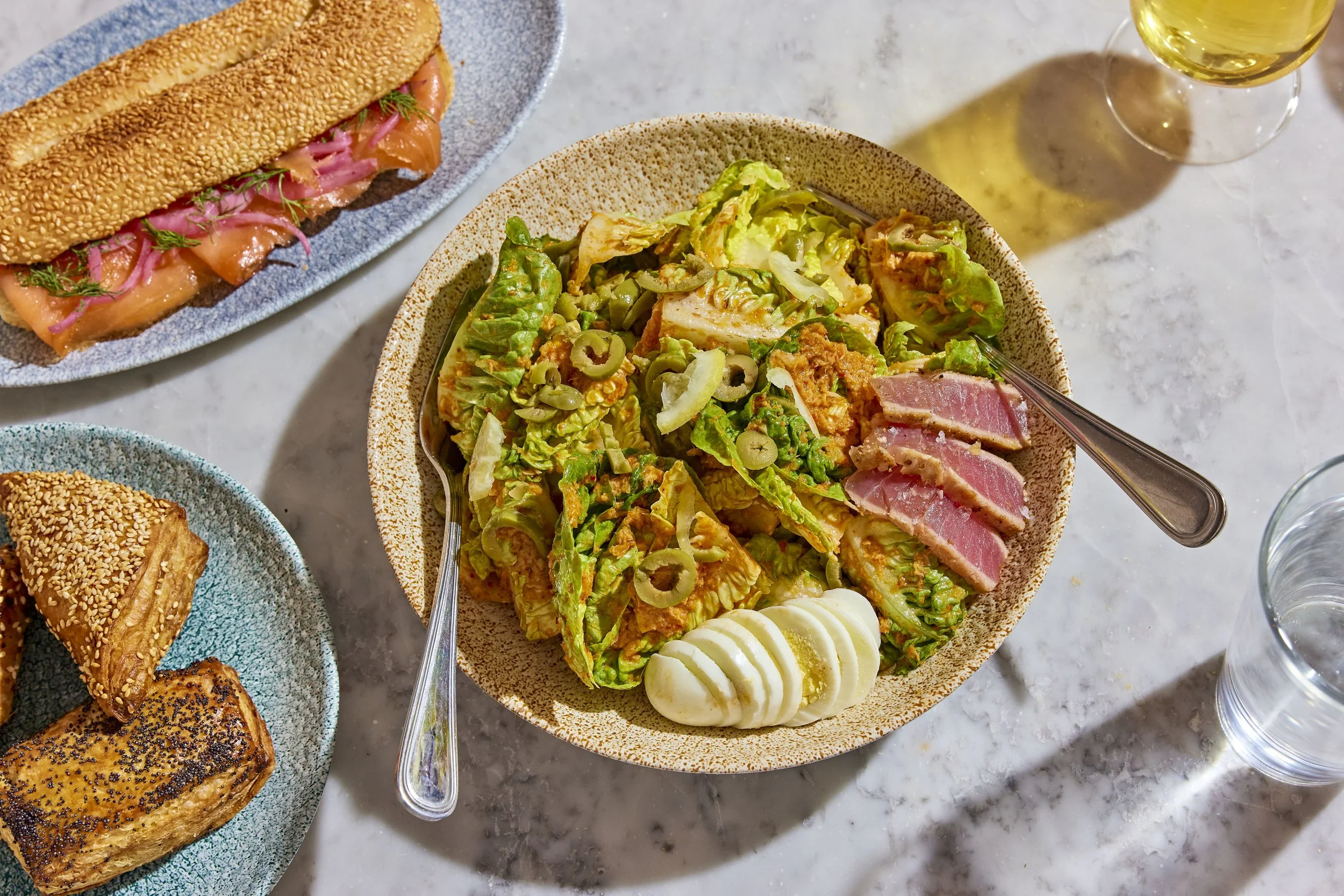 K'Far's menu features Israeli pastries – such as borekas with Bulgarian feta, chocolate rugelach, and babka – and lunch menu of salads and grain bowls, as well as toasts made with traditional Yemenite Kubaneh bread and pressed Jerusalem Bagel sandwiches, all made in-house. Beverage-wise, K'Far offers a full coffee drink menu with beans by local favorite, Ox Coffee, and cocktails.